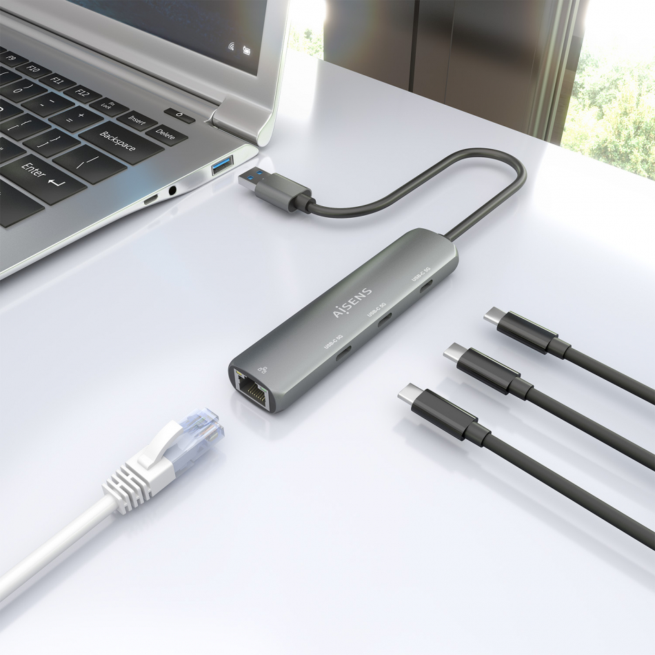 AISENS USB3.0 Dock USB-A A Ethernet Gigabit + Hub 3xUSB-C, Gris, 15cm, Alámbrico, USB 3.2 Gen 1 (3.1 Gen 1) Type-A, 10,100,1000 Mbit/s, IEEE 802.3, IEEE 802.3ab, IEEE 802.3u, Gris, USB