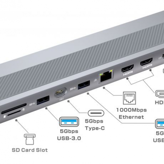 Supervelocidad en la trasmisión de datos USB 3.2 Gen 1 Puerto USB-C Video hasta 4K@60Hz en sus tres puertos, 2 HDMI y 1 Display Port Red Ethernet de 1Gb Lectores de tarjetas SD/TF 2.0 Puerto Tipo-C PD 100W Puerto de micrófono/audio