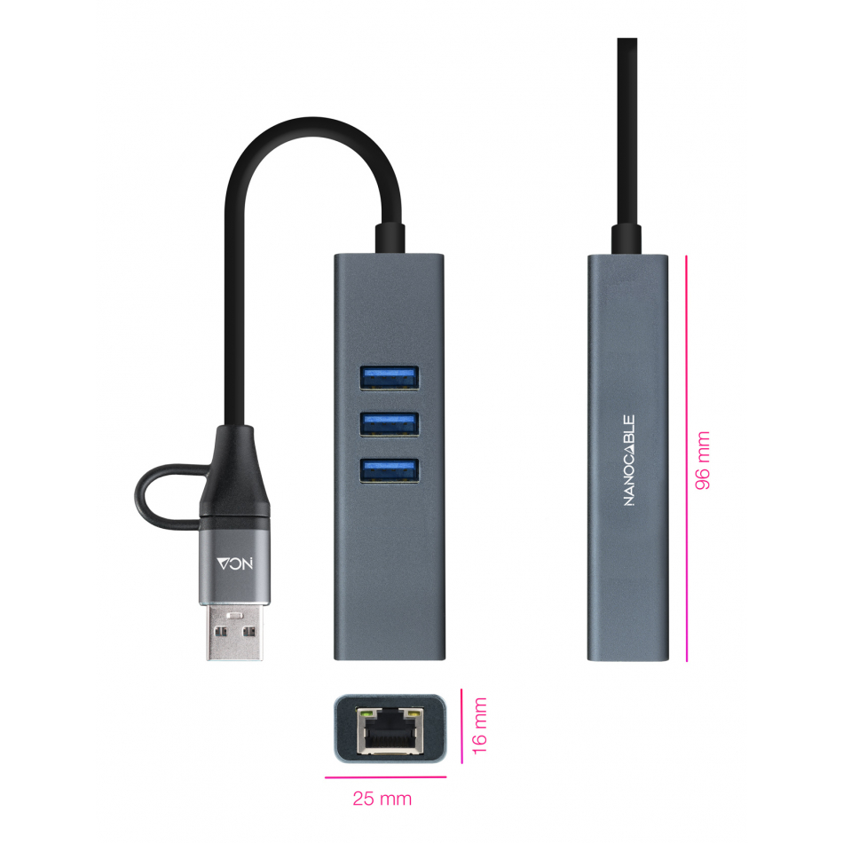 Nanocable Conversor USB-C+USB-A/M 3.0 a Ethernet + 3xUSB-A 3.0, Aluminio, Gris, 15 cm, Alámbrico, USB 3.2 Gen 1 (3.1 Gen 1) Type-C, 1000 Mbit/s, Gris, Acrilonitrilo butadieno estireno (ABS), Aluminio, USB