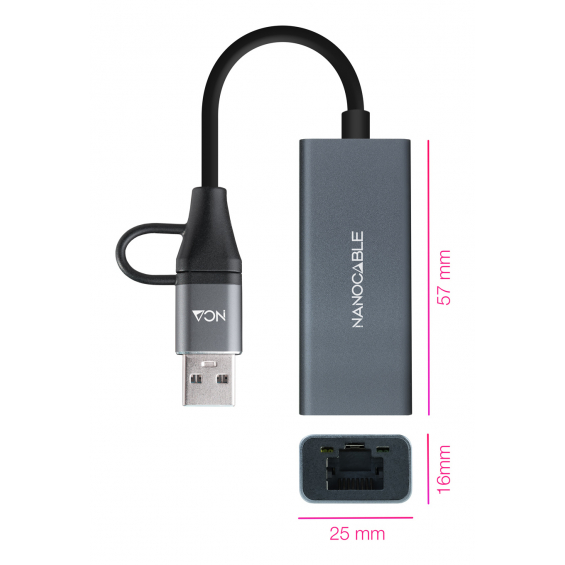 Nanocable Conversor USB-C+USB-A/M 3.0 a Ethernet, Aluminio, Gris, 15 cm, Alámbrico, USB 3.2 Gen 1 (3.1 Gen 1) Type-C, 1000 Mbit/s, Gris, Acrilonitrilo butadieno estireno (ABS), Aluminio, USB
