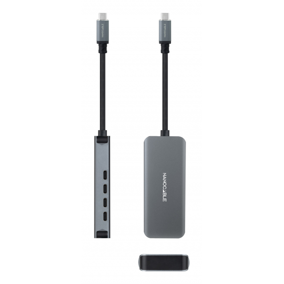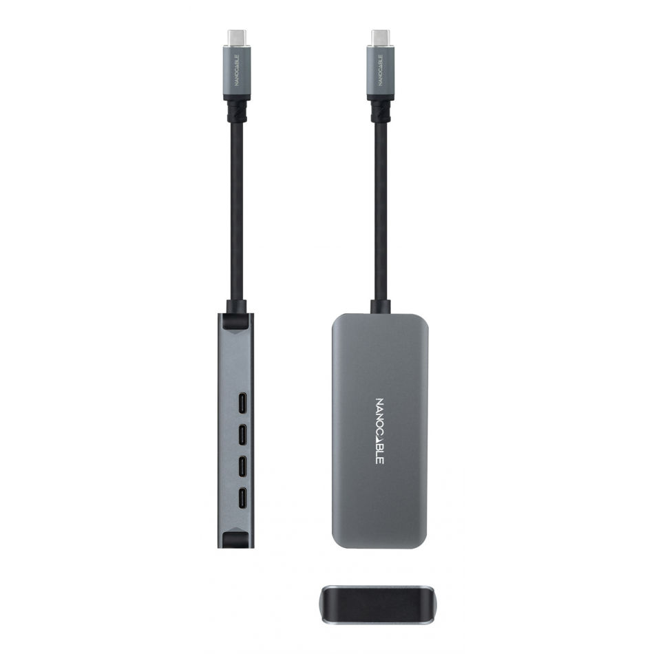 Nanocable Hub USB-C macho a 4 x USB-C hembra, Aluminio 10 cm, Gris, USB 3.2 Gen 1 (3.1 Gen 1) Type-C, USB 3.2 Gen 1 (3.1 Gen 1) Type-C, 5000 Mbit/s, Gris, Aluminio, 0,1 m