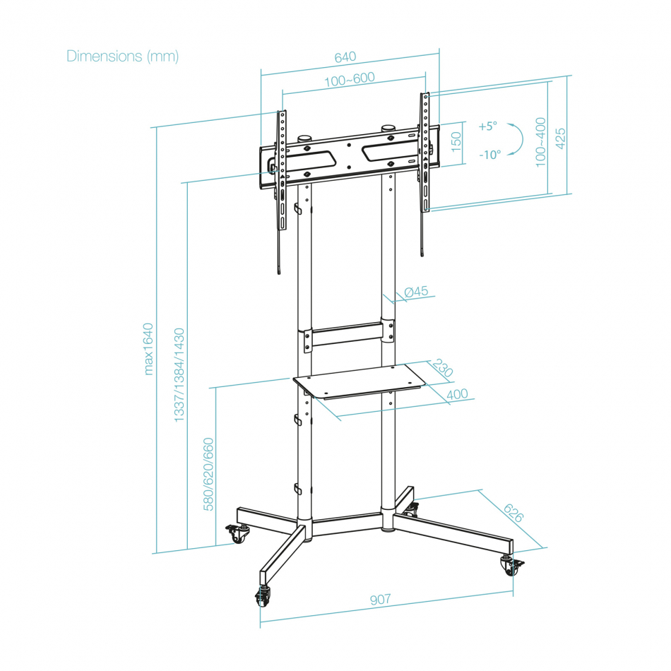 TooQ “KEFRÉN” Soporte de suelo con Ruedas para pantallas de 37”-70”, Negro, 177,8 cm (70"), 100 x 100 mm, 600 x 400 mm, -10 - 5°, Acero, Negro