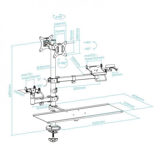 TooQ Soporte de Mesa para TPV/Impresora/Pantallas 17”-32”/Terminal/Lector/Teclado, Atornillado, 18 kg, 43,2 cm (17"), 81,3 cm (32"), 100 x 100 mm, Negro